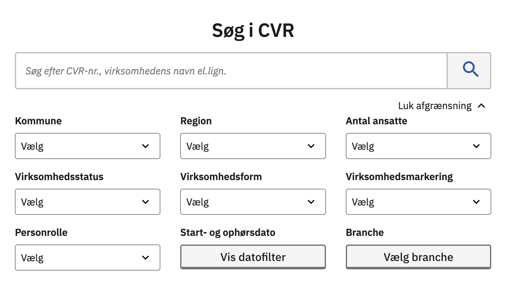 Billede: Screen shot af alle søgemulighederne, når du vælger “Afgræns søgning” på cvr.dk.